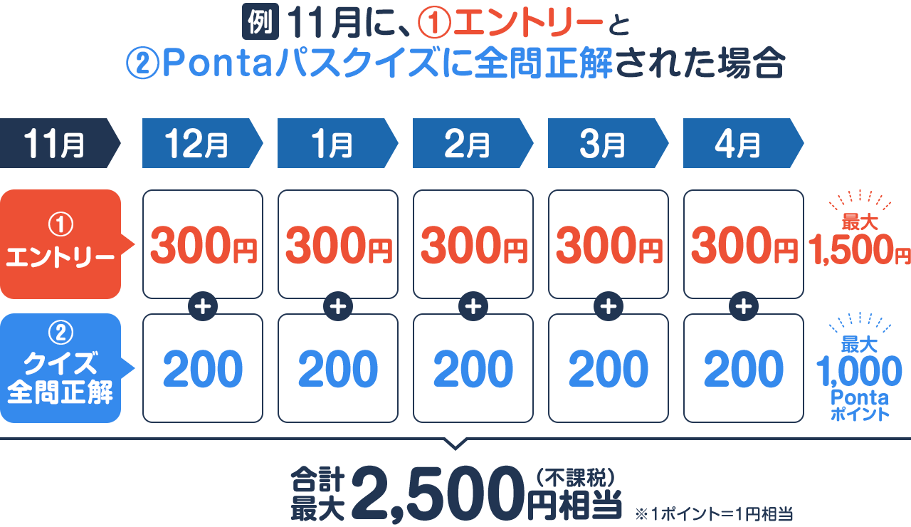 - ※Pontaポイントは、翌月末頃から5ヶ月間にわたり、1ヶ月200Pontaポイントで分割して還元します。