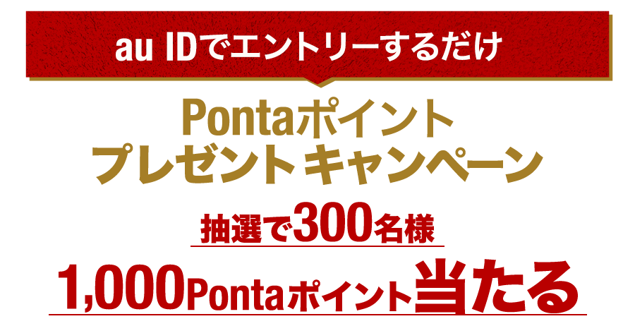 - ・本ページの「エントリー」ボタンよりau IDログインした方から、抽選で300名様にPontaポイント1000ポイントが当たります!