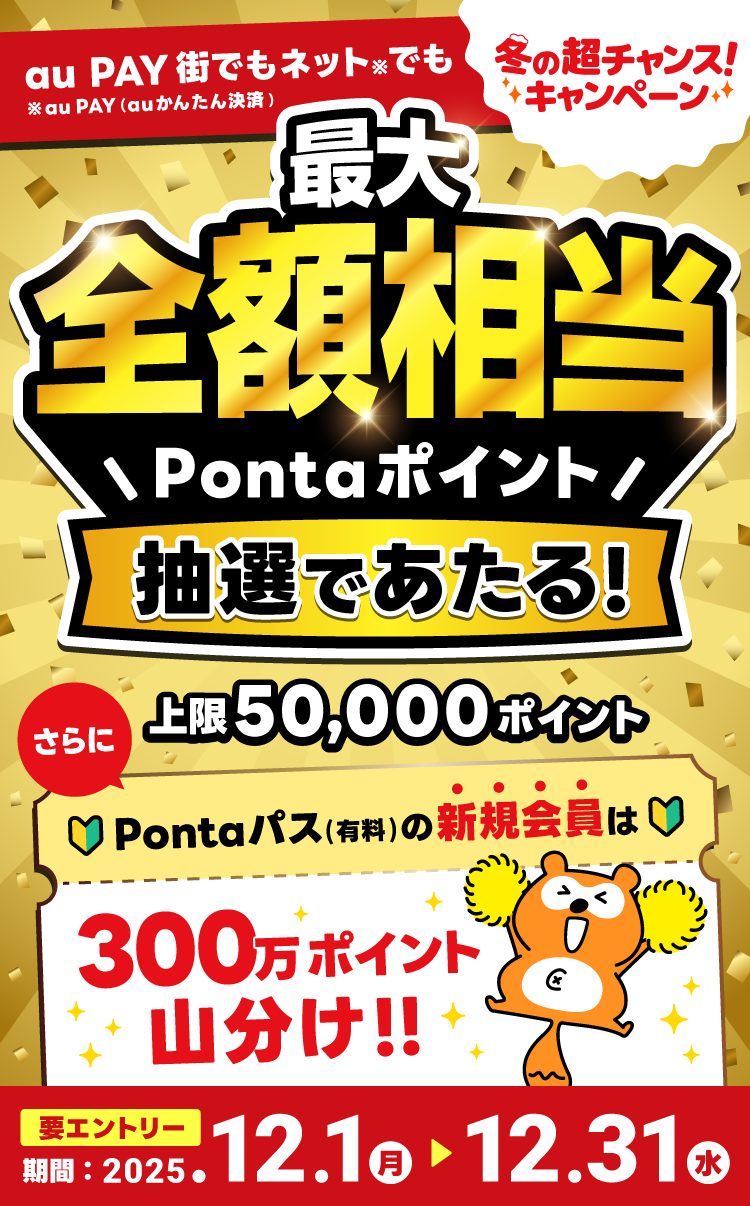 ![au PAY 冬の超チャンス!キャンペーン 街とネットでau PAYご利用で最大全額相当Pontaポイントあたる!さらにPontaパス新規会員は300万P山分け[期間:2025/12/1~2025/12/31]](https://kantan.auone.jp/sp/campaign/auPAYchance202512/img/mv.png)